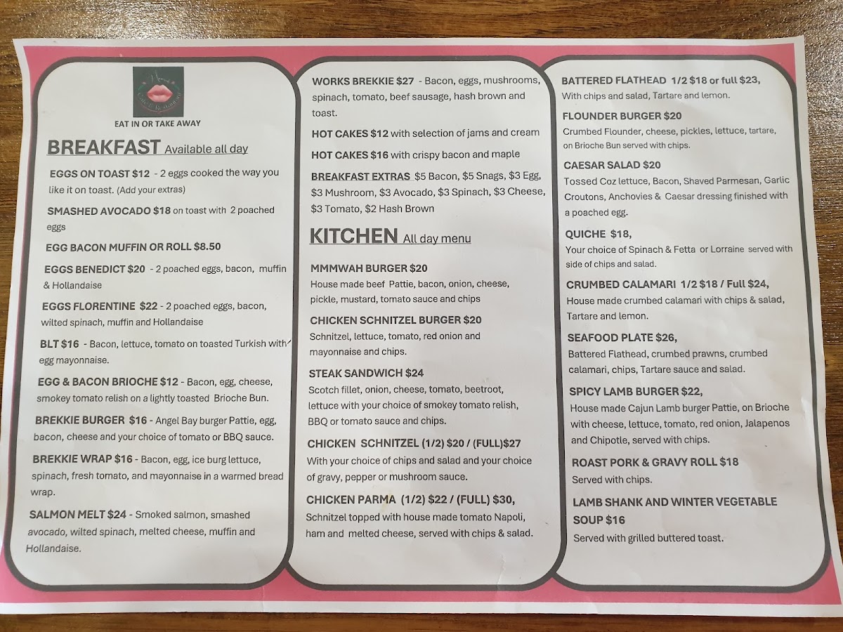 - Breakfast: This section features a range of traditional and contemporary breakfast items such as eggs served on toast, eggs benedict, eggs florentine, various muffins and rolls, and specialty dishes like the brekkie burger and brekkie wrap. There are also options like the salmon melt and the "Works" brekkie for more substantial morning meals.